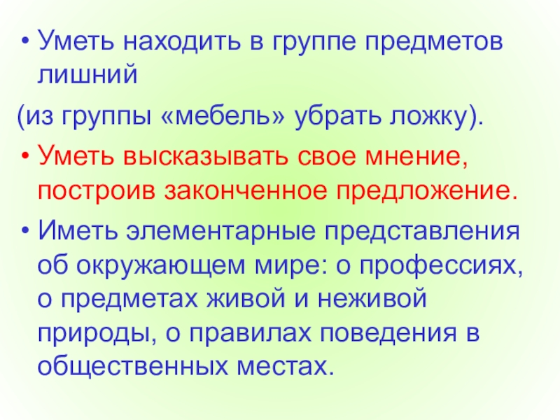 Уметь объединять предметы в группы: мебель, транспорт, одежда, обувь, растения, животные и т. д.