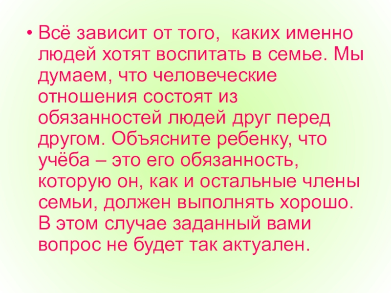 Слайд 24Всё зависит от того, каких именно людей хотят воспитать в семье.