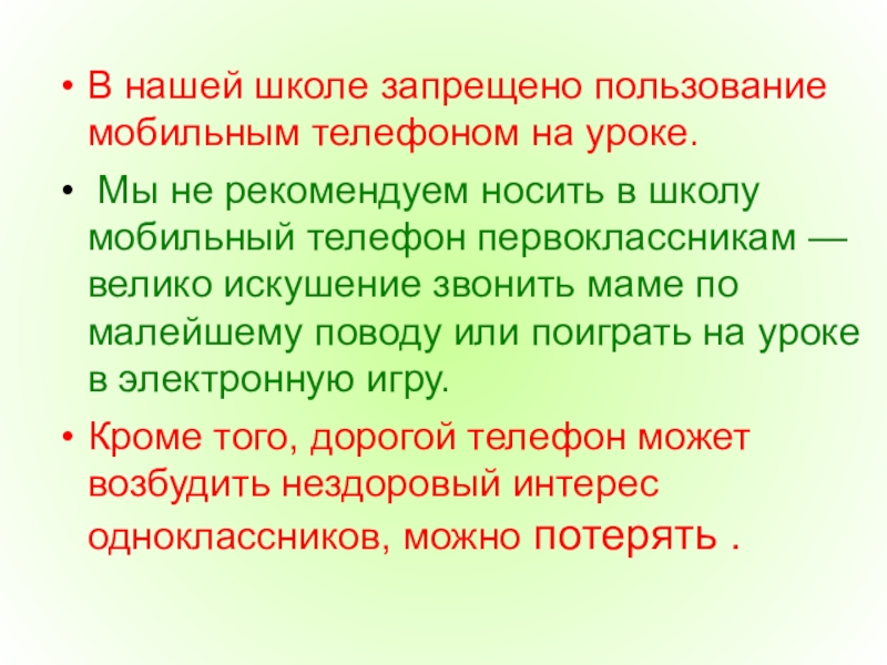 рекомендуем носить в школу мобильный телефон первоклассникам — велико искушение звонить маме по малейшему поводу или поиграть на уроке в электронную игру.
