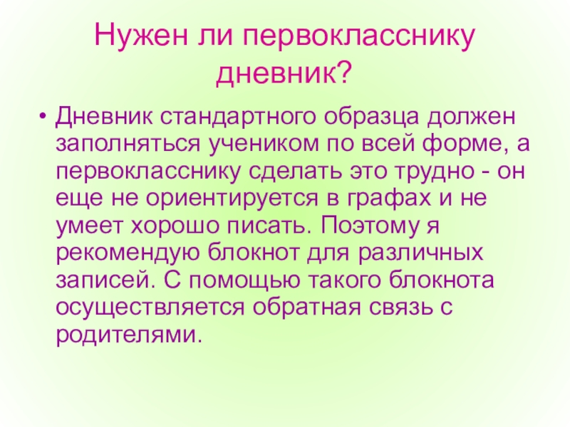всей форме, а первокласснику сделать это трудно - он еще не ориентируется в графах и не умеет хорошо писать. Поэтому я рекомендую блокнот для различных записей. С помощью такого блокнота осуществляется обратная связь с родителями.