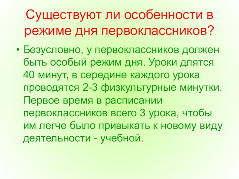 особый режим дня. Уроки длятся 40 минут, в середине каждого урока проводятся 2-3 физкультурные минутки. Первое время в расписании первоклассников всего 3 урока, чтобы им легче было привыкать к новому виду деятельности - учебной.