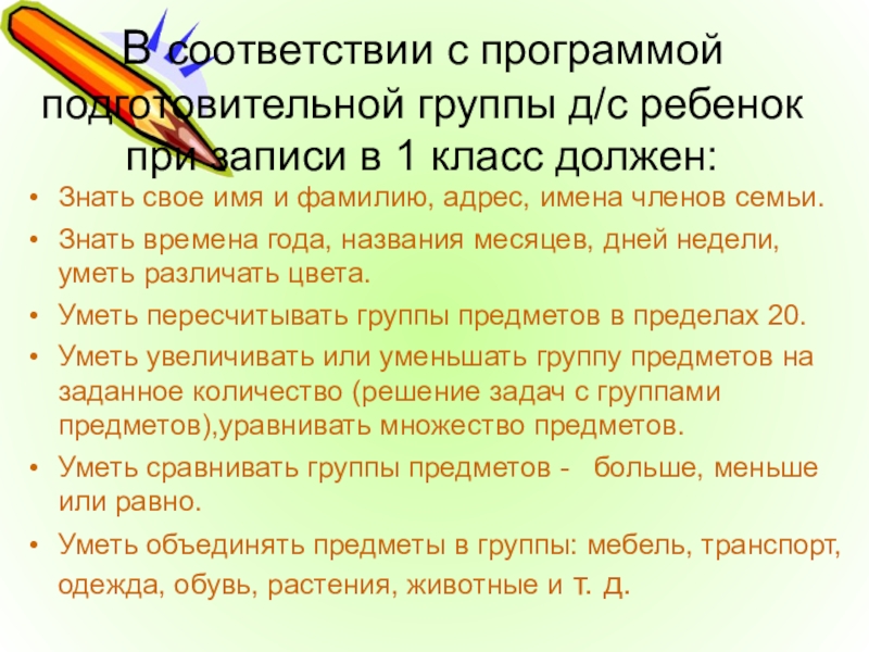 Слайд 6В соответствии с программой подготовительной группы д/с ребенок при записи в