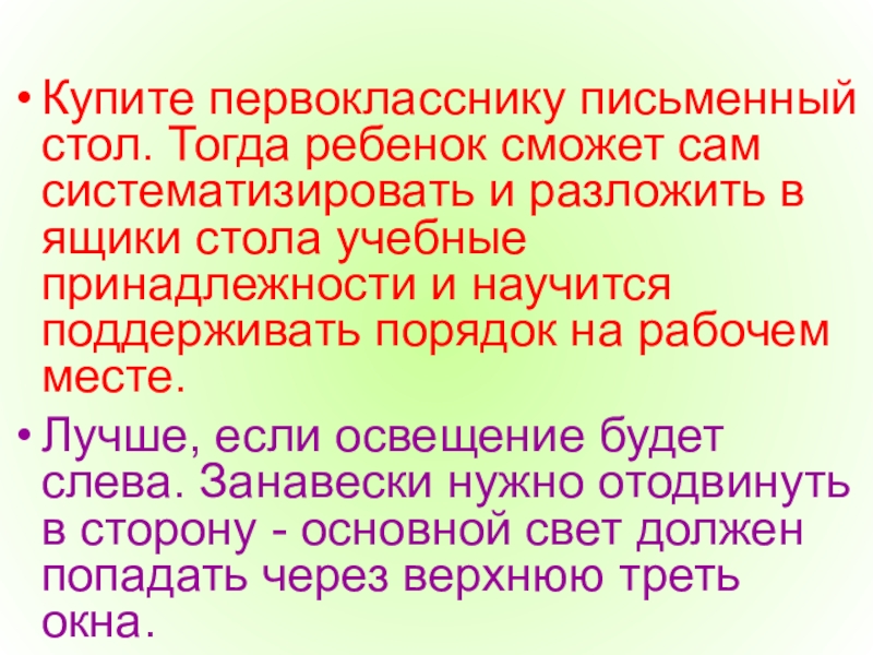 Слайд 29Купите первокласснику письменный стол. Тогда ребенок сможет сам систематизировать и разложить
