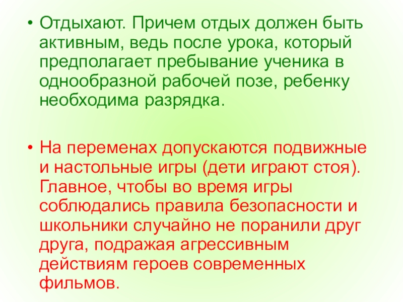 Слайд 26Отдыхают. Причем отдых должен быть активным, ведь после урока, который предполагает