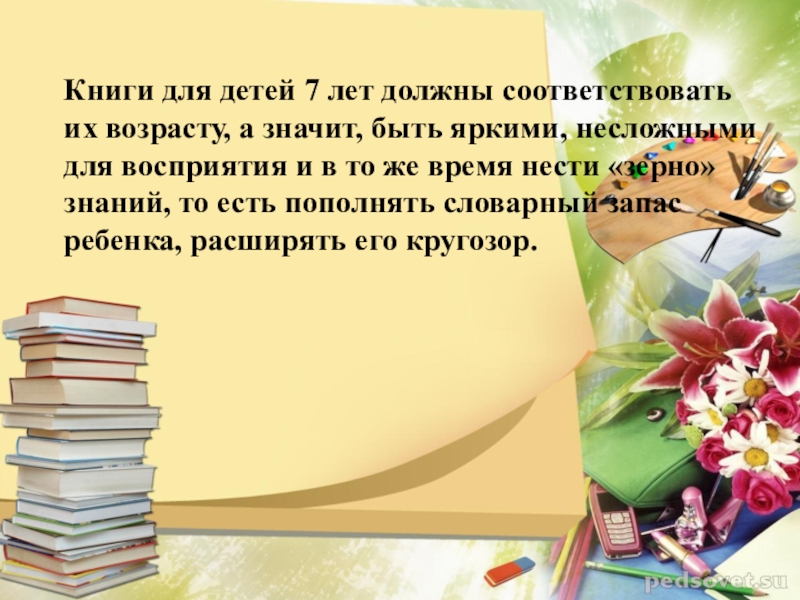 Слайд 9Книги для детей 7 лет должны соответствовать их возрасту, а значит,