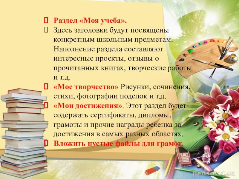 «Мои достижения». Этот раздел будет содержать сертификаты, дипломы, грамоты и прочие награды ребенка за достижения в самых разных областях.