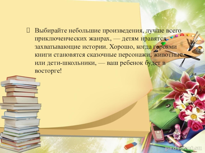 Слайд 8Выбирайте небольшие произведения, лучше всего приключенческих жанрах, — детям нравятся захватывающие истории.