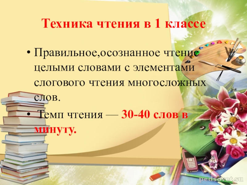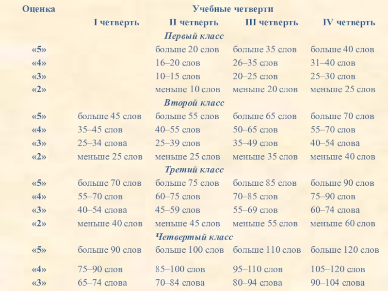 Темп чтения — 30-40 слов в минуту.