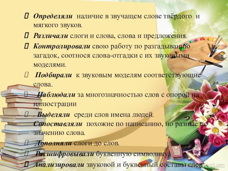 Слайд 5Определяли наличие в звучащем слове твёрдого и мягкого звуков.