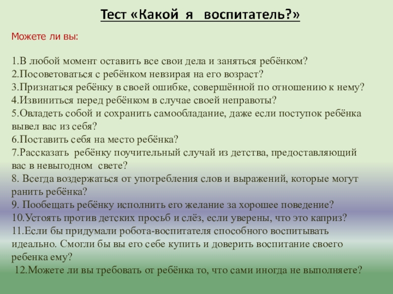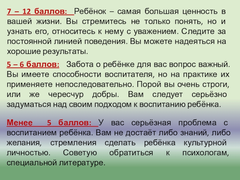 Менее 5 баллов: У вас серьёзная проблема с воспитанием ребёнка. Вам не достаёт либо знаний, либо желания, стремления сделать ребёнка культурной личностью. Советую обратиться к психологам, специальной литературе.
