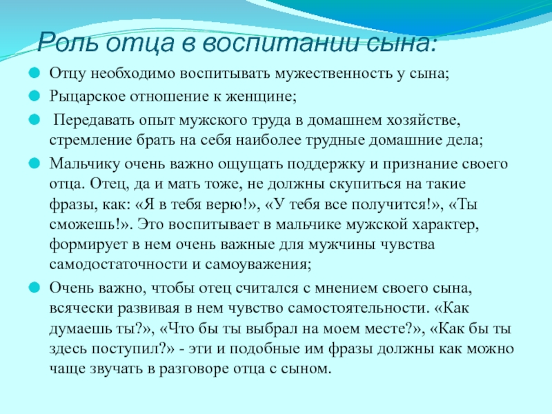 Очень важно, чтобы отец считался с мнением своего сына, всячески развивая в нем чувство самостоятельности. «Как думаешь ты?», «Что бы ты выбрал на моем месте?», «Как бы ты здесь поступил?» - эти и подобные им фразы должны как можно чаще звучать в разговоре отца с сыном.