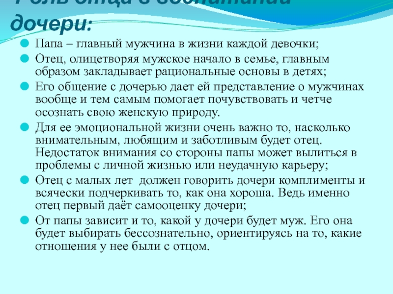 Его общение с дочерью дает ей представление о мужчинах вообще и тем самым помогает почувствовать и четче осознать свою женскую природу.