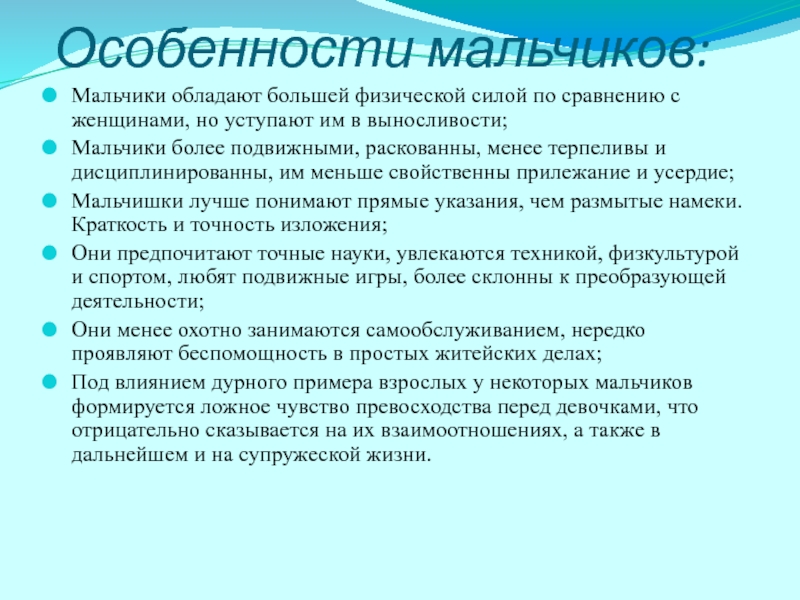 Мальчишки лучше понимают прямые указания, чем размытые намеки. Краткость и точность изложения;