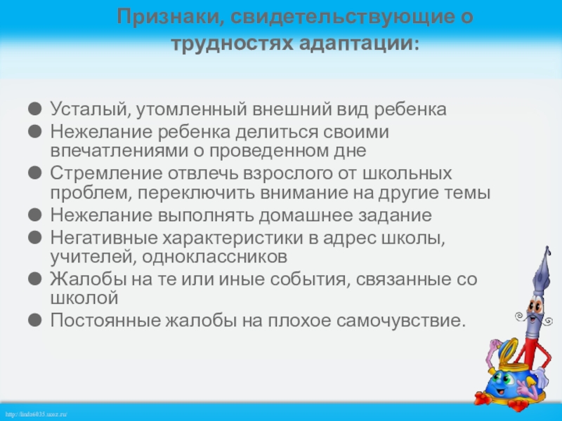 Слайд 11Признаки, свидетельствующие о трудностях адаптации: