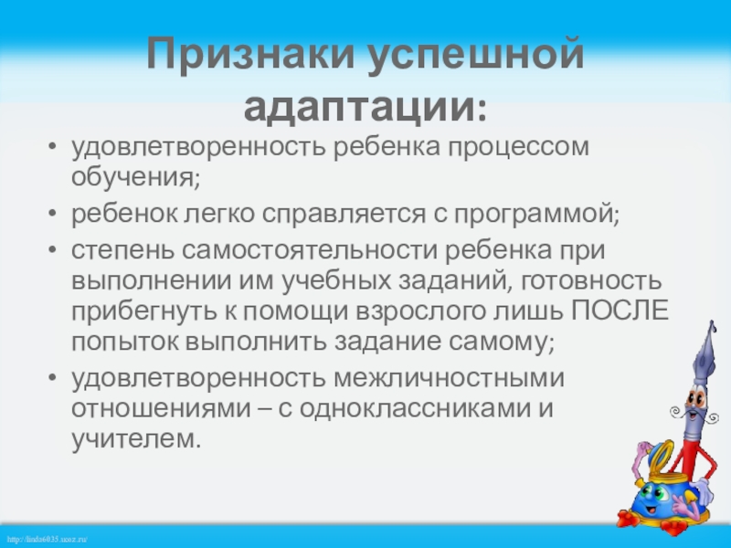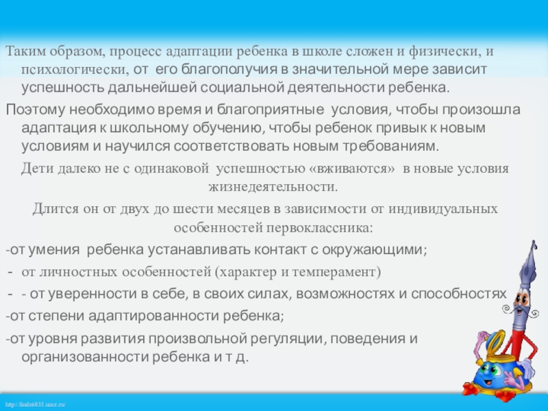 Поэтому необходимо время и благоприятные условия, чтобы произошла адаптация к школьному обучению, чтобы ребенок привык к новым условиям и научился соответствовать новым требованиям.