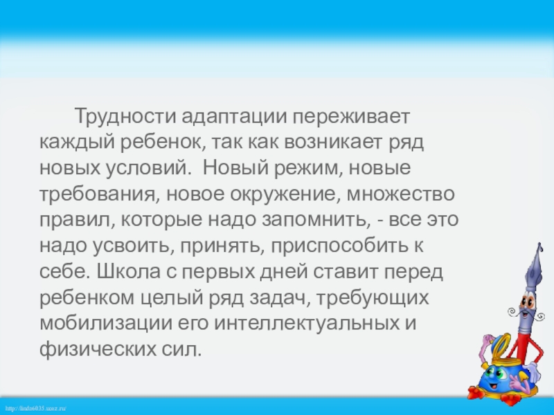 Новый режим, новые требования, новое окружение, множество правил, которые надо запомнить, - все это надо усвоить, принять, приспособить к себе. Школа с первых дней ставит перед ребенком целый ряд задач, требующих мобилизации его интеллектуальных и физических сил.