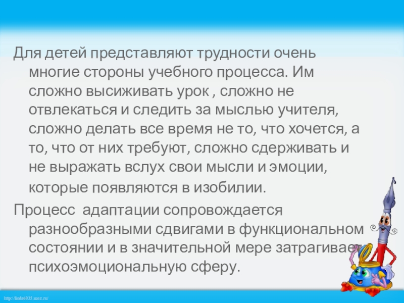Слайд 3Для детей представляют трудности очень многие стороны учебного процесса. Им сложно