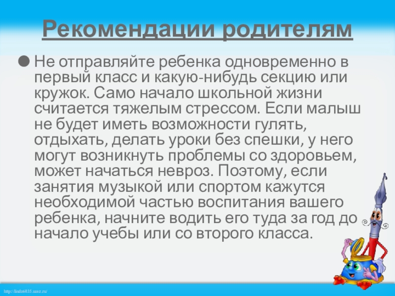 или кружок. Само начало школьной жизни считается тяжелым стрессом. Если малыш не будет иметь возможности гулять, отдыхать, делать уроки без спешки, у него могут возникнуть проблемы со здоровьем, может начаться невроз. Поэтому, если занятия музыкой или спортом кажутся необходимой частью воспитания вашего ребенка, начните водить его туда за год до начало учебы или со второго класса.