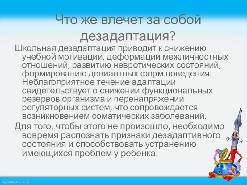 Для того, чтобы этого не произошло, необходимо вовремя распознать признаки дезадаптивного состояния и способствовать устранению имеющихся проблем у ребенка.