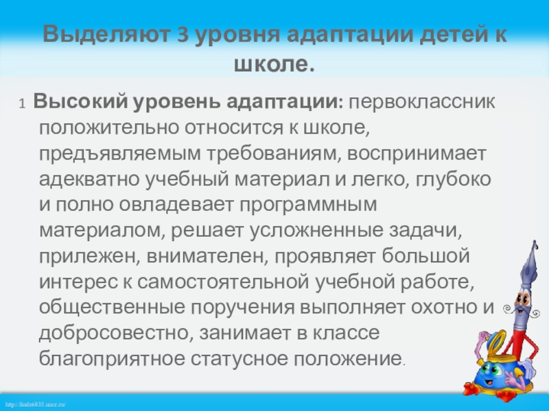 Слайд 6Выделяют 3 уровня адаптации детей к школе.
