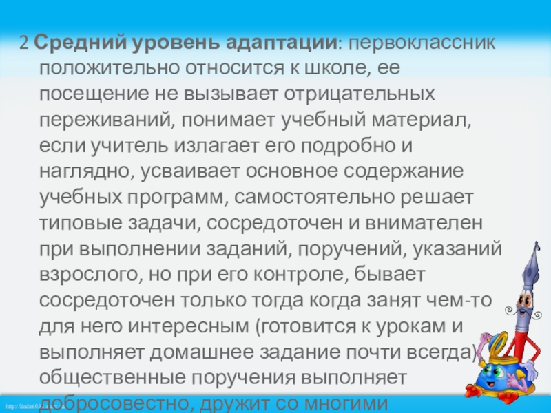 Слайд 72 Средний уровень адаптации: первоклассник положительно относится к школе, ее посещение