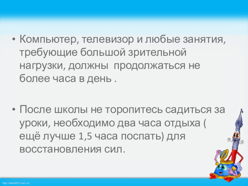 Слайд 15Компьютер, телевизор и любые занятия, требующие большой зрительной нагрузки, должны продолжаться
