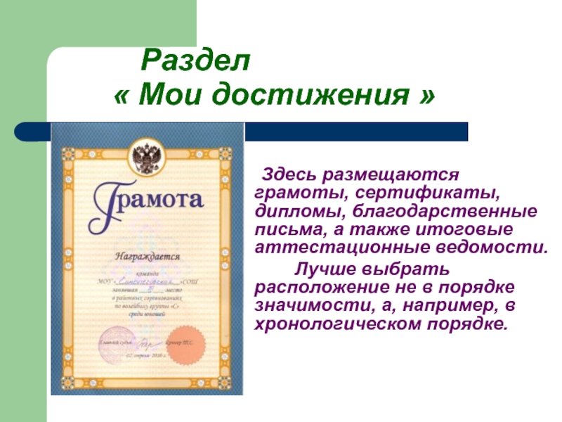 Здесь размещаются грамоты, сертификаты, дипломы, благодарственные письма,