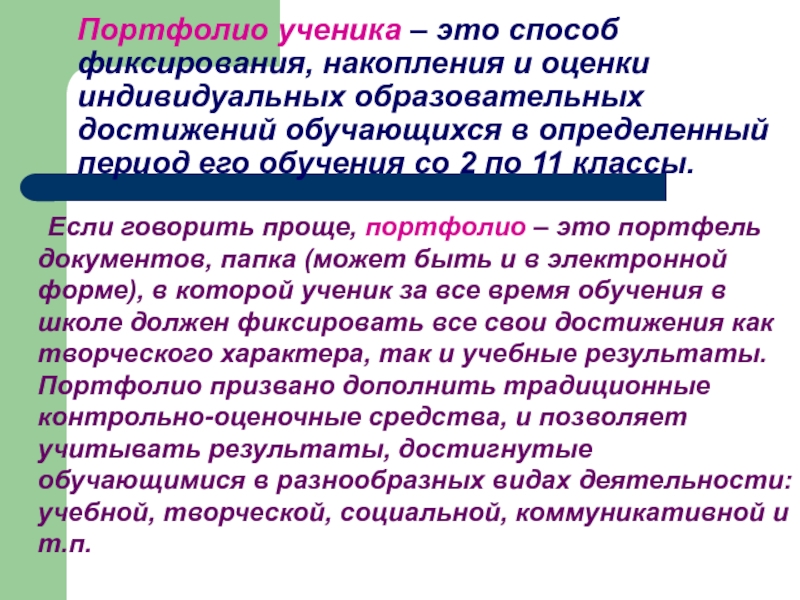 Если говорить проще, портфолио – это портфель документов, папка (может быть и в электронной форме), в которой ученик за все время обучения в школе должен фиксировать все свои достижения как творческого характера, так и учебные результаты. Портфолио призвано дополнить традиционные контрольно-оценочные средства, и позволяет учитывать результаты, достигнутые обучающимися в разнообразных видах деятельности: учебной, творческой, социальной, коммуникативной и т.п.