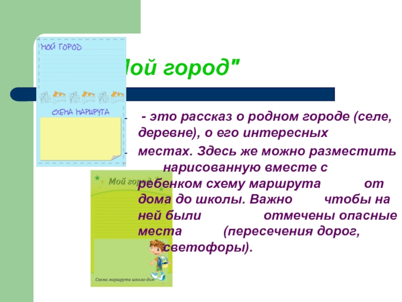 местах. Здесь же можно разместить нарисованную вместе с ребенком схему маршрута от дома до школы. Важно чтобы на ней были отмечены опасные места (пересечения дорог, светофоры).