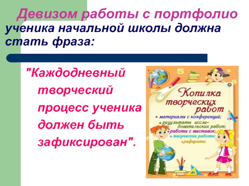 Слайд 6 Девизом работы с портфолио ученика начальной школы должна стать фраза: