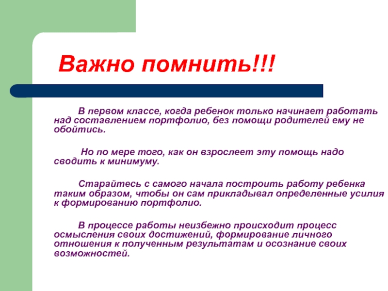 Старайтесь с самого начала построить работу ребенка таким образом, чтобы он сам прикладывал определенные усилия к формированию портфолио.