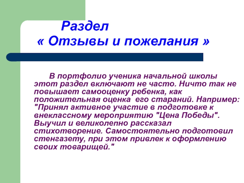 раздел включают не часто. Ничто так не повышает самооценку ребенка, как положительная оценка его стараний. Например: "Принял активное участие в подготовке к внеклассному мероприятию "Цена Победы". Выучил и великолепно рассказал стихотворение. Самостоятельно подготовил стенгазету, при этом привлек к оформлению своих товарищей."