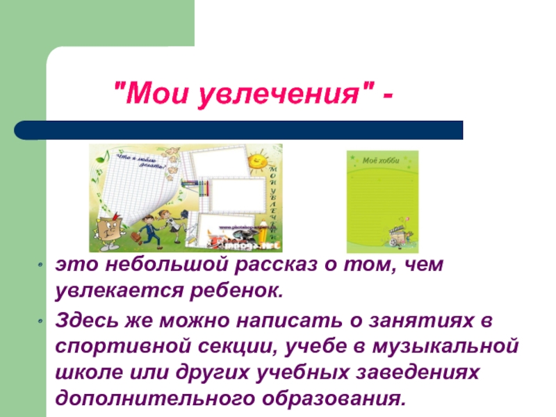 это небольшой рассказ о том, чем увлекается ребенок.