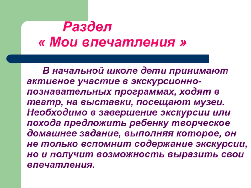 в экскурсионно-познавательных программах, ходят в театр, на выставки, посещают музеи. Необходимо в завершение экскурсии или похода предложить ребенку творческое домашнее задание, выполняя которое, он не только вспомнит содержание экскурсии, но и получит возможность выразить свои впечатления.