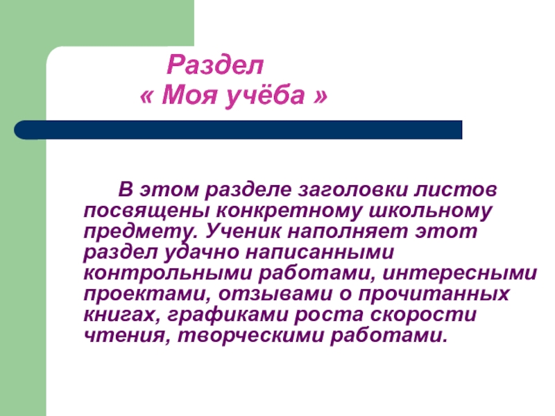 школьному предмету. Ученик наполняет этот раздел удачно написанными контрольными работами, интересными проектами, отзывами о прочитанных книгах, графиками роста скорости чтения, творческими работами.