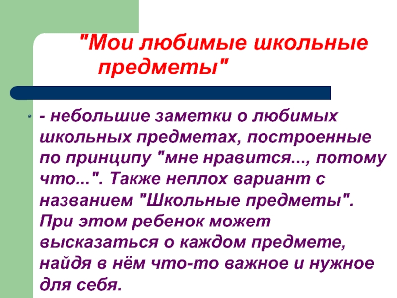 по принципу "мне нравится..., потому что...". Также неплох вариант с названием "Школьные предметы". При этом ребенок может высказаться о каждом предмете, найдя в нём что-то важное и нужное для себя.