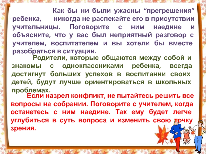Если назрел конфликт, не пытайтесь решить все вопросы на собрании. Поговорите с учителем, когда останетесь с ним наедине. Так ему будет легче углубиться в суть вопроса и изменить свою точку зрения.