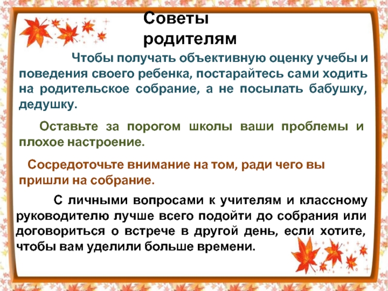 С личными вопросами к учителям и классному руководителю лучше всего подойти до собрания или договориться о встрече в другой день, если хотите, чтобы вам уделили больше времени.