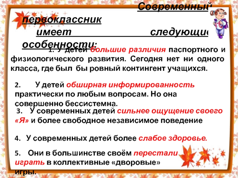 1. У детей большие различия паспортного и физиологического развития. Сегодня нет ни одного класса, где был бы ровный контингент учащихся.