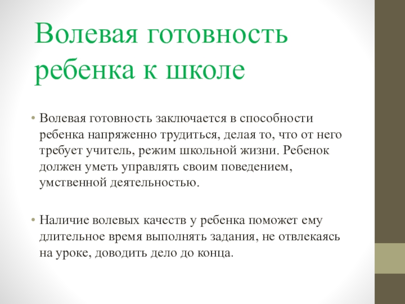 трудиться, делая то, что от него требует учитель, режим школьной жизни. Ребенок должен уметь управлять своим поведением, умственной деятельностью.
