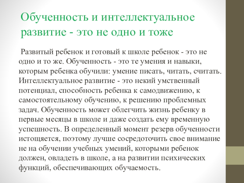 Слайд 13Обученность и интеллектуальное развитие - это не одно и тоже