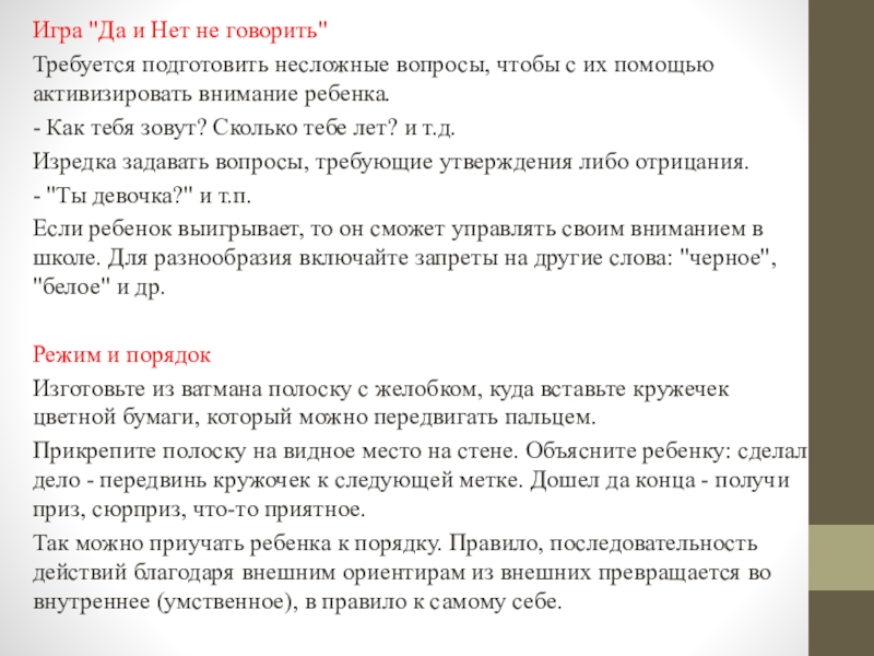 Если ребенок выигрывает, то он сможет управлять своим вниманием в школе. Для разнообразия включайте запреты на другие слова: "черное", "белое" и др.