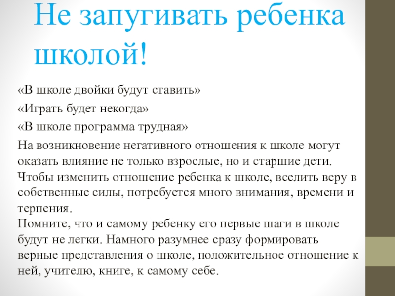 Помните, что и самому ребенку его первые шаги в школе будут не легки. Намного разумнее сразу формировать верные представления о школе, положительное отношение к ней, учителю, книге, к самому себе.