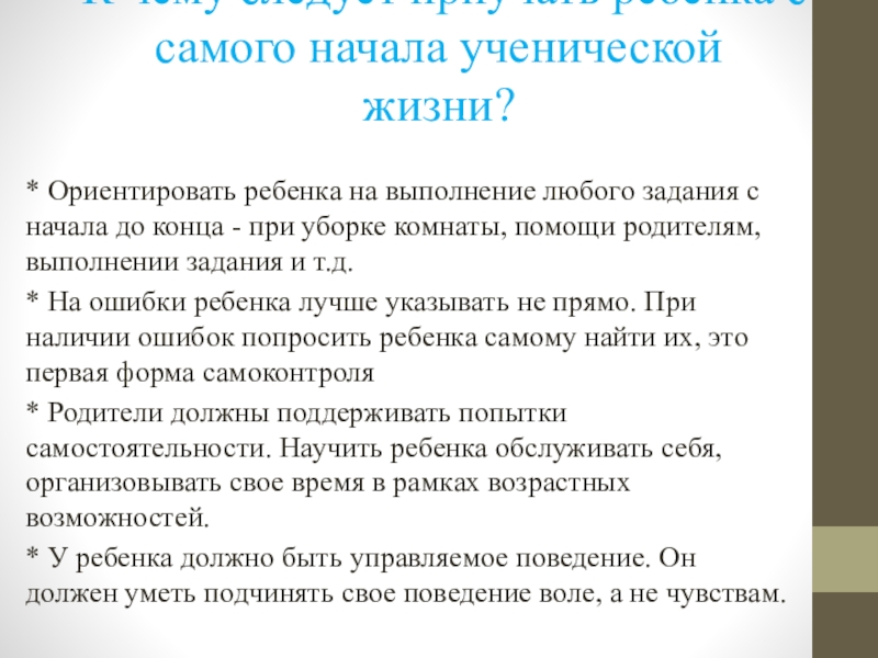 Слайд 9К чему следует приучать ребенка с самого начала ученической жизни?