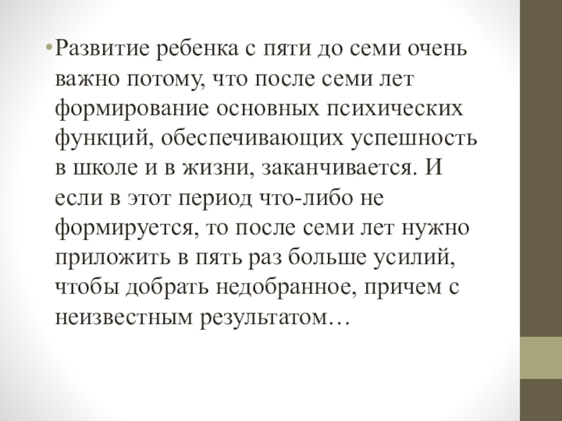 Слайд 12Развитие ребенка с пяти до семи очень важно потому, что после