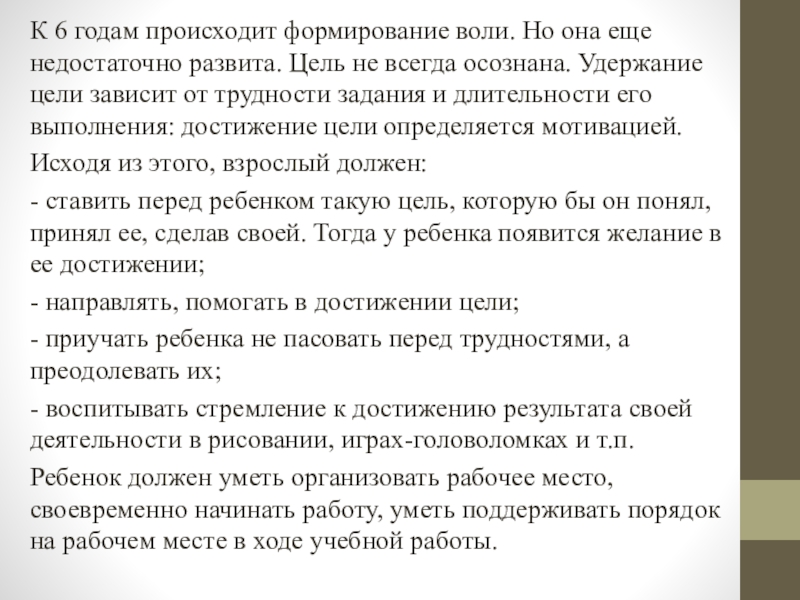 Слайд 8К 6 годам происходит формирование воли. Но она еще недостаточно развита.