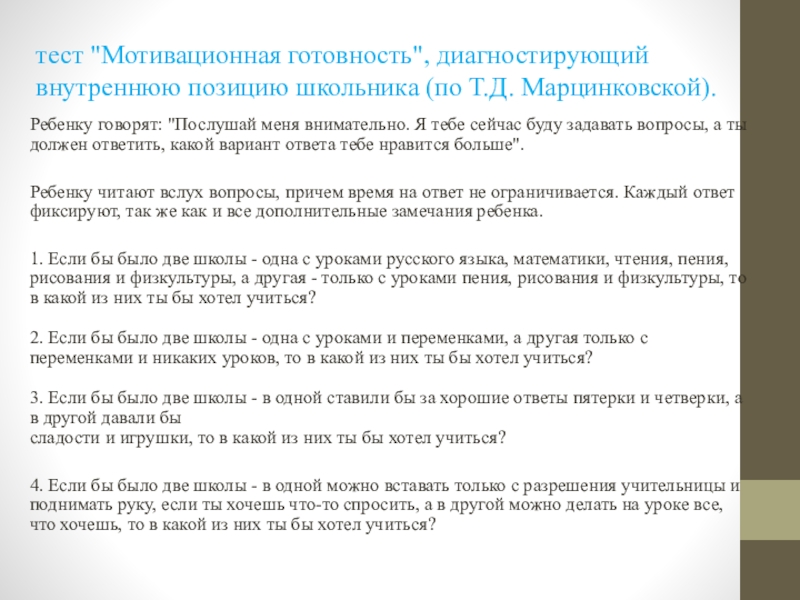 Слайд 4тест "Мотивационная готовность", диагностирующий внутреннюю позицию школьника (по Т.Д. Марцинковской).