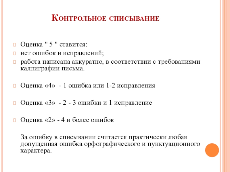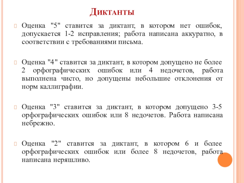 Диктанты Оценка "5" ставится за диктант, в котором нет ошибок, допускается 1-2 исправления; работа написана аккуратно, в соответствии с требованиями письма.Оценка "4" ставится за диктант, в котором допущено не более 2 орфографических ошибок или 4 недочетов,