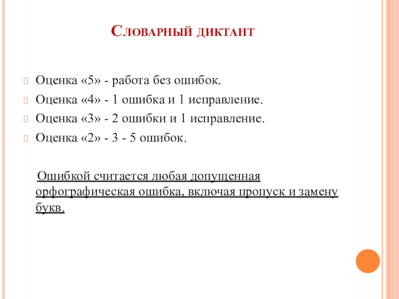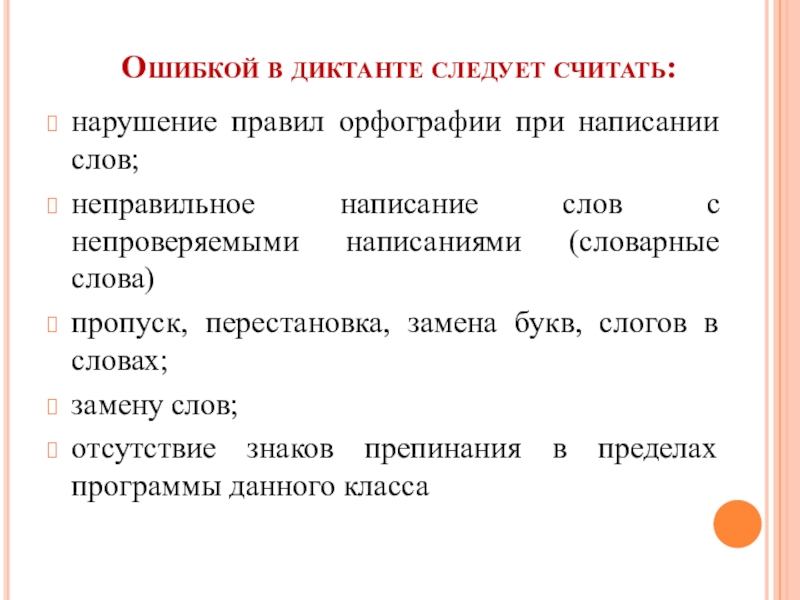 Ошибкой в диктанте следует считать: нарушение правил орфографии при написании слов;неправильное написание слов с непроверяемыми написаниями (словарные
