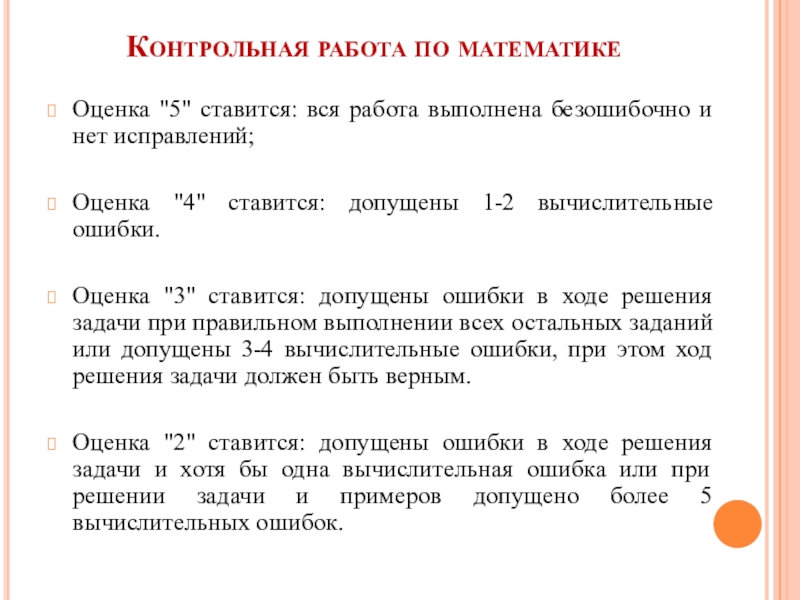 Оценка "2" ставится: допущены ошибки в ходе решения задачи и хотя бы одна вычислительная ошибка или при решении задачи и примеров допущено более 5 вычислительных ошибок.